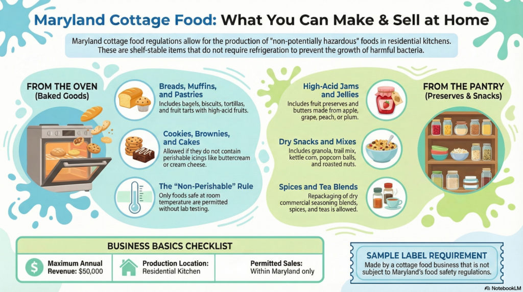 For more information about what foods can be sold under cottage food regulations, visit the official Maryland Cottage Food Businesses site or read these guidelines.