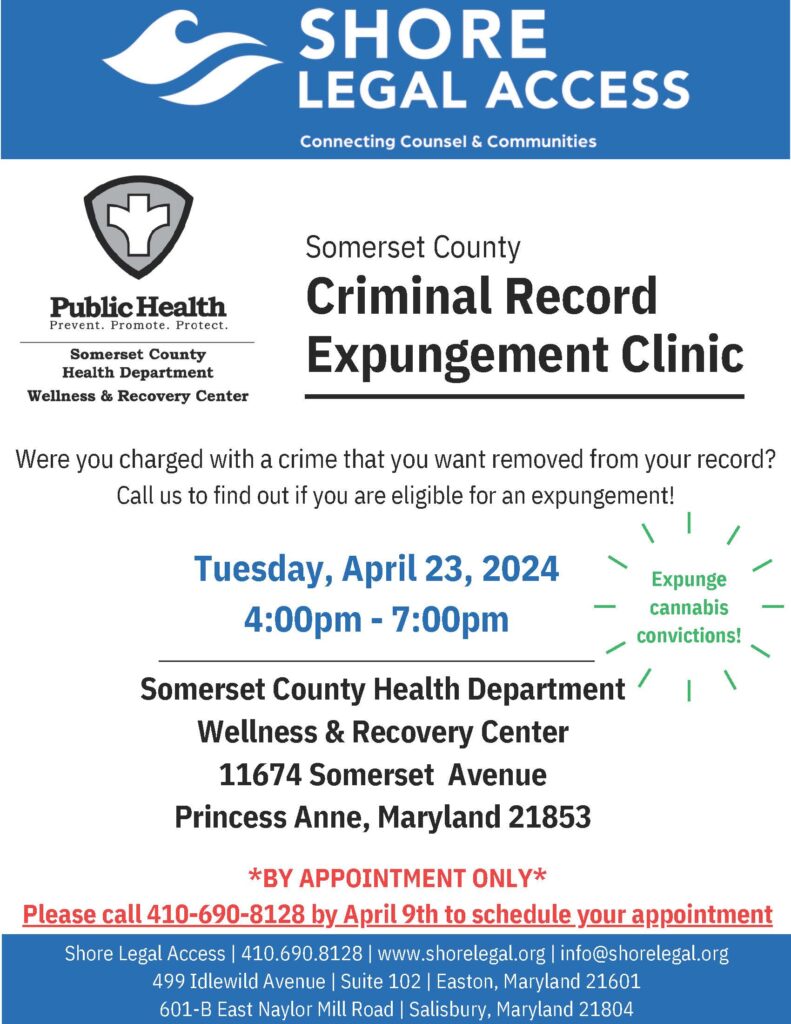 Shore Legal Access is holding an expungement clinic from 4pm – 7pm Tuesday April 23, 2024, at the Somerset County Health Department’s Wellness and Recovery Center located at 11674 Somerset Ave, Princess Anne, MD 21853.