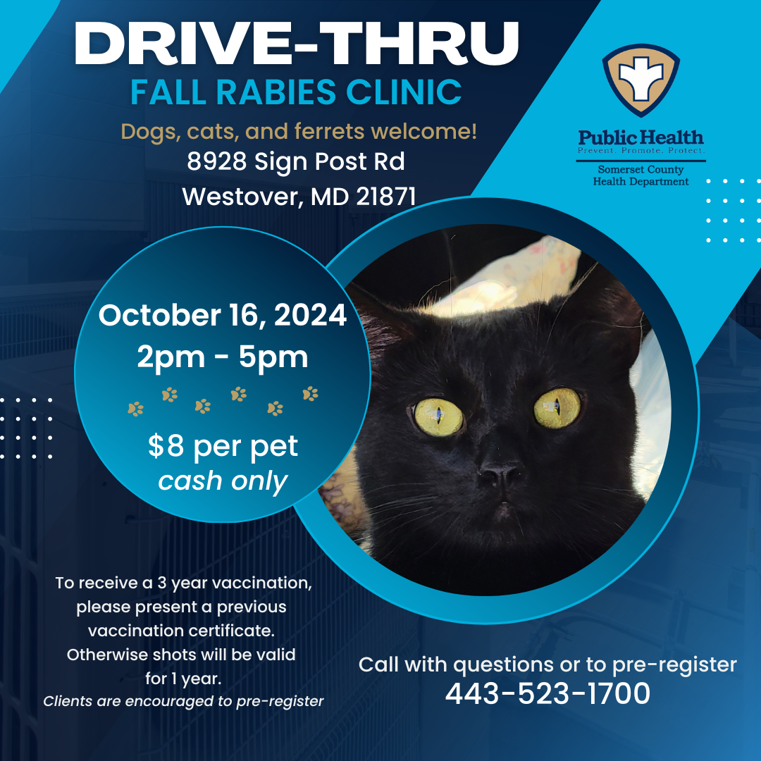 SCHD’s Fall Rabies Clinic will be held on Tuesday, October 16, 2024 from 2pm – 5pm at the health department’s campus at 8928 Sign Post Rd, Westover, MD.