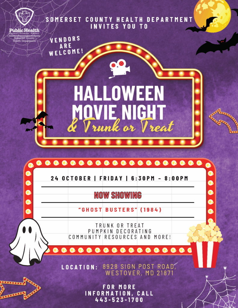 Join the Somerset County Health Department for our annual Halloween Movie Night and Trunk or Treat! Friday, October 24, 2025 from 6:30 – 8pm at Sign Post Road in Westover. Vendors welcome! Call 443-523-1700. ← Previous News Release | Next News Release →