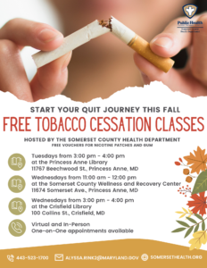 (Westover, MD) – Smoking leads to disease, disability, and harms nearly every organ in the body. Beginning September 6 and September 7, the Somerset County Health Department will be hosting adult smoking cessation classes at different locations in the county.