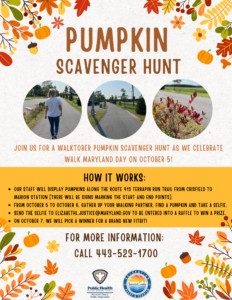 (Westover, MD) – In celebration of Walk Maryland Day, the Somerset County Health Department and Somerset County Recreation and Parks are excited to invite you to walk and join us for our Pumpkin Scavenger Hunt on the Route 413 Terrapin Run Trail from Marion Station to Crisfield, beginning October 5, 2022.